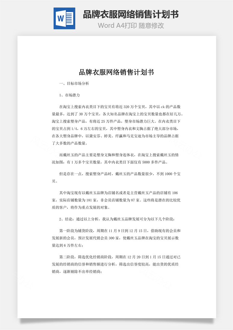 本模板为品牌衣服网络销售计划书word文档,文字图片可以直接替换,使用简单方便