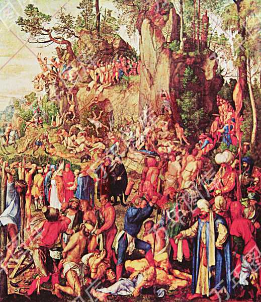 文件名称: 17、丢勒作品《完名殉教的基督教徒》(Martyrdom of the Ten Thousand Christians ),作于1508年。.tif